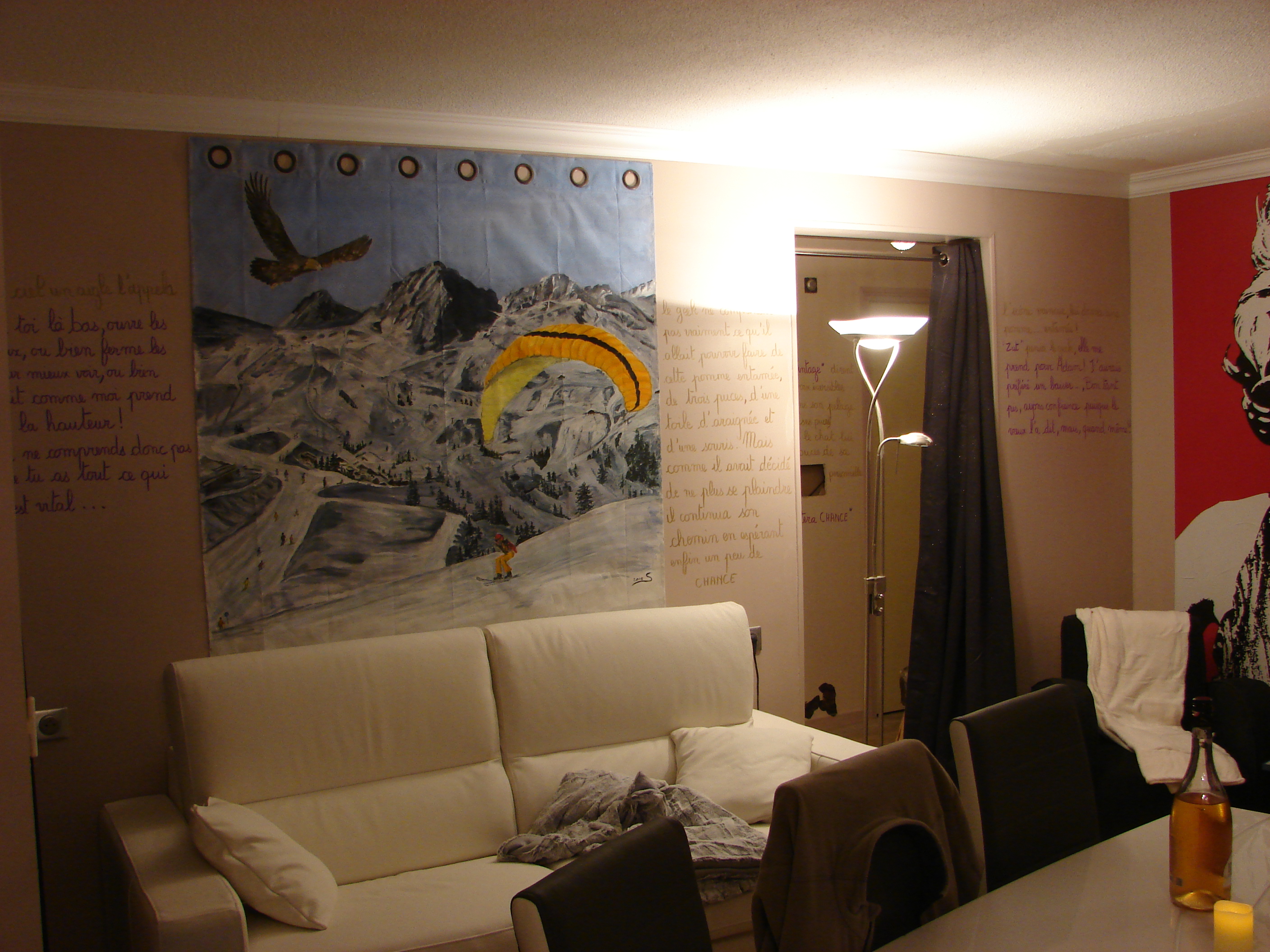 Pièce de vie: composée d'un canapé rapido (140*190), d'un canapé confort, d'une grande table avec des chaises confort, une table basse, une télévision, une cheminée électrique, un bow window avec vue sur le Mont Blanc, un accès au balcon